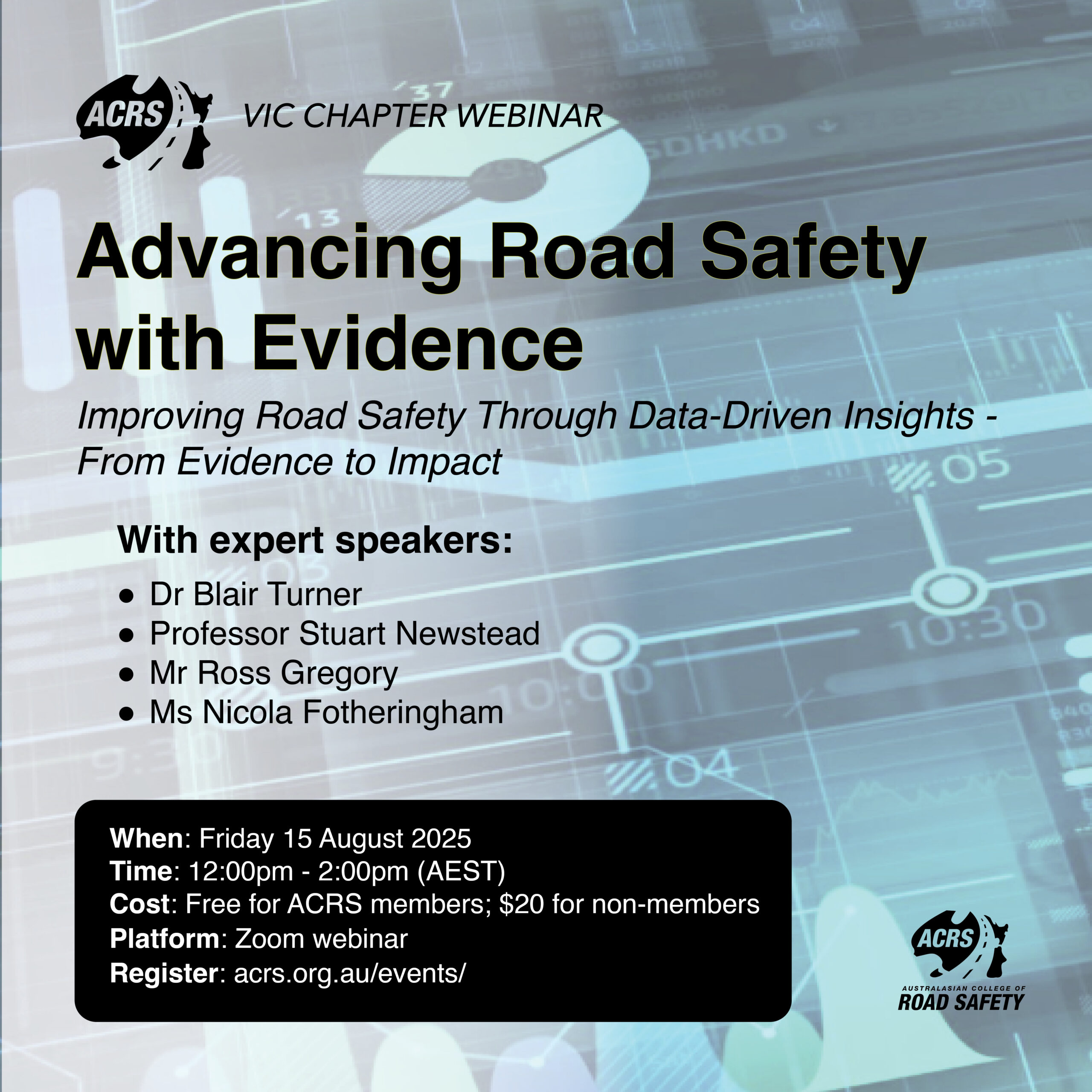 The ACRS Victoria Chapter is pleased to invite you to a thought-provoking and timely webinar titled “Improving Road Safety Through Data-Driven Insights: From Evidence to Impact.” This session will bring together four distinguished experts to explore how innovative uses of data are shaping the future of road safety in Australia and internationally.